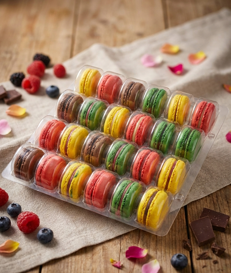 מבחר של 24 מקרונים בטעמי וניל, אספרו, מנגו ופטל.